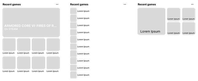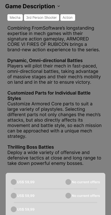 The inspiration for the layout was taken from streaming services, as they deal with extense catalogs that are not there for an explicit sale to the user, unlike game stores which’s goal is only to sell.