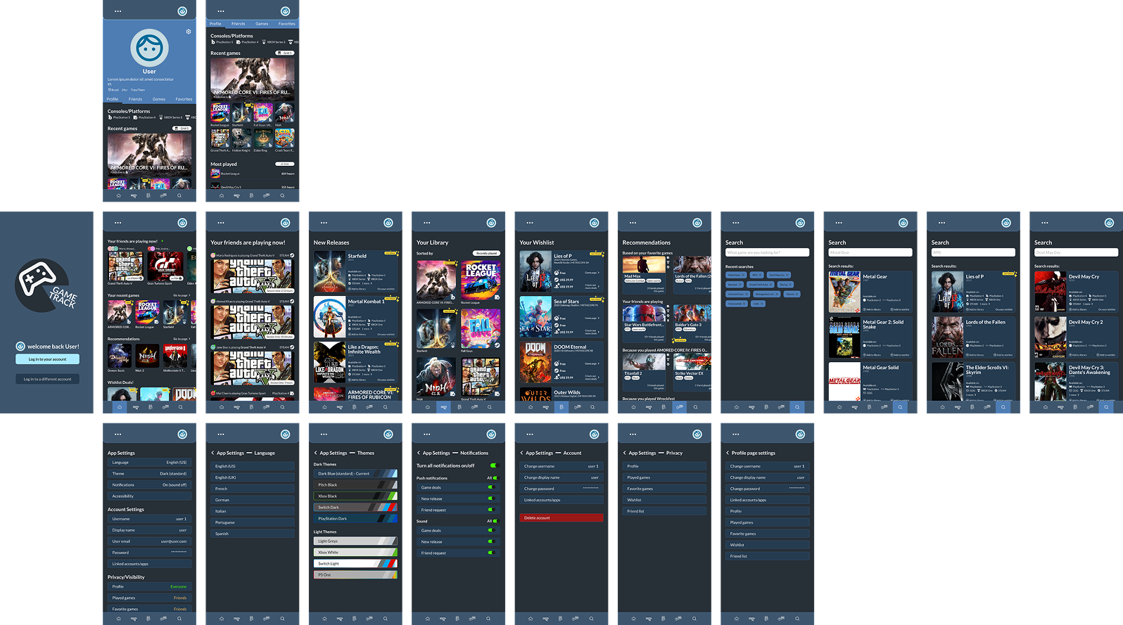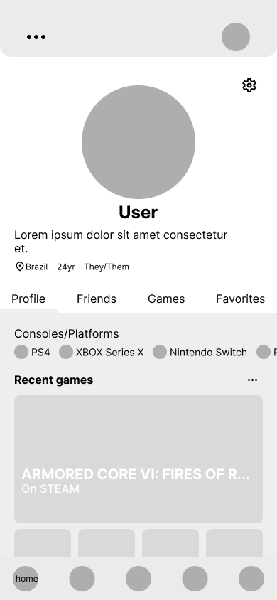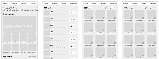 Both theses social medias allow users to navigate through different sections in each others profile, and in this case, these pages were adapted to the main profile, friends page, complete games list, and favorite games.